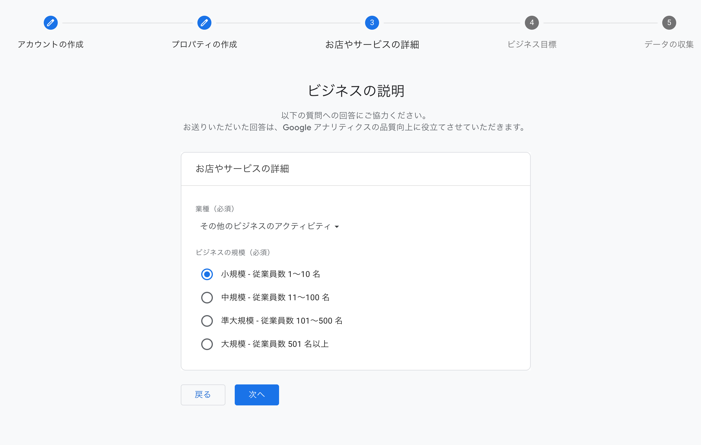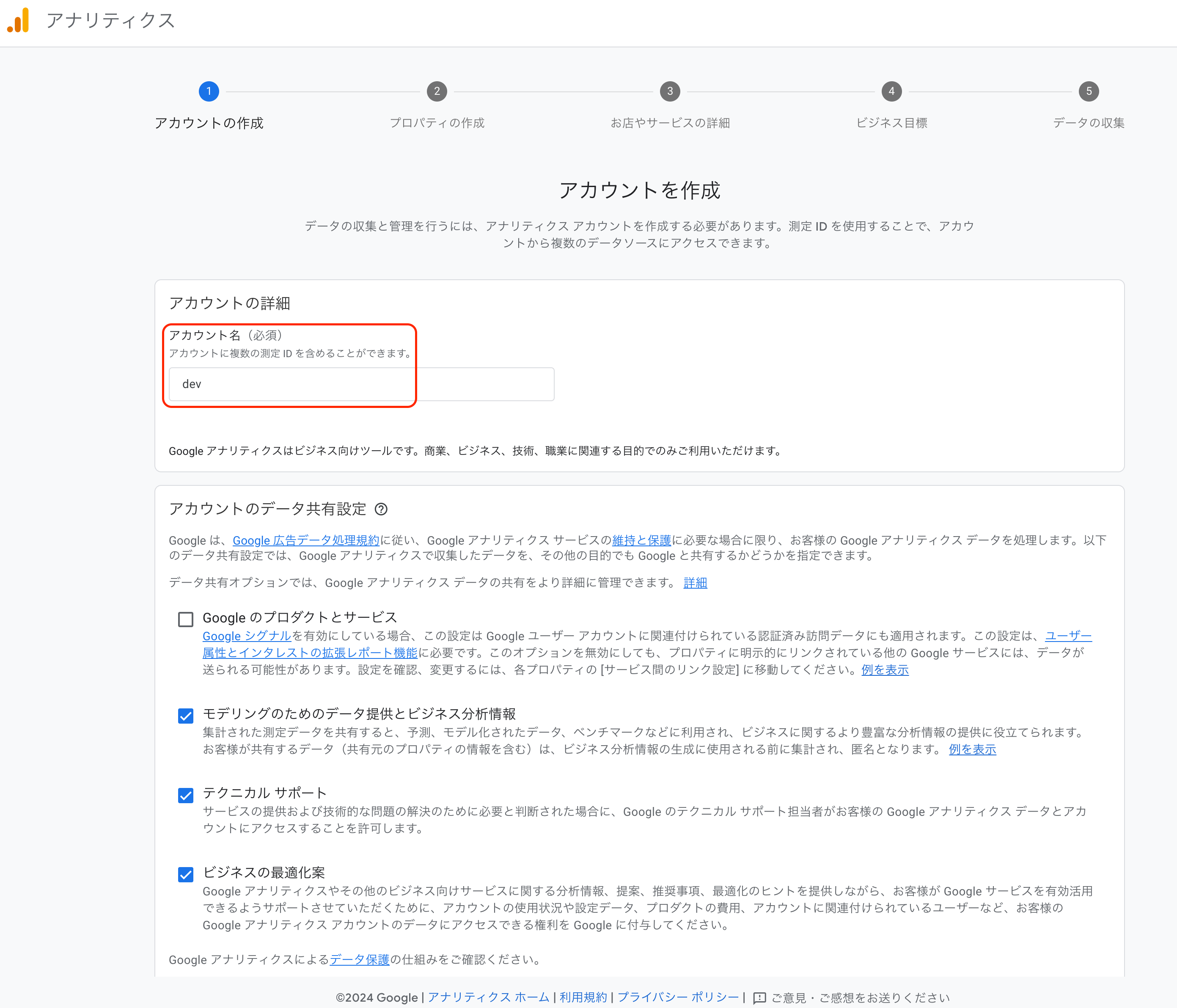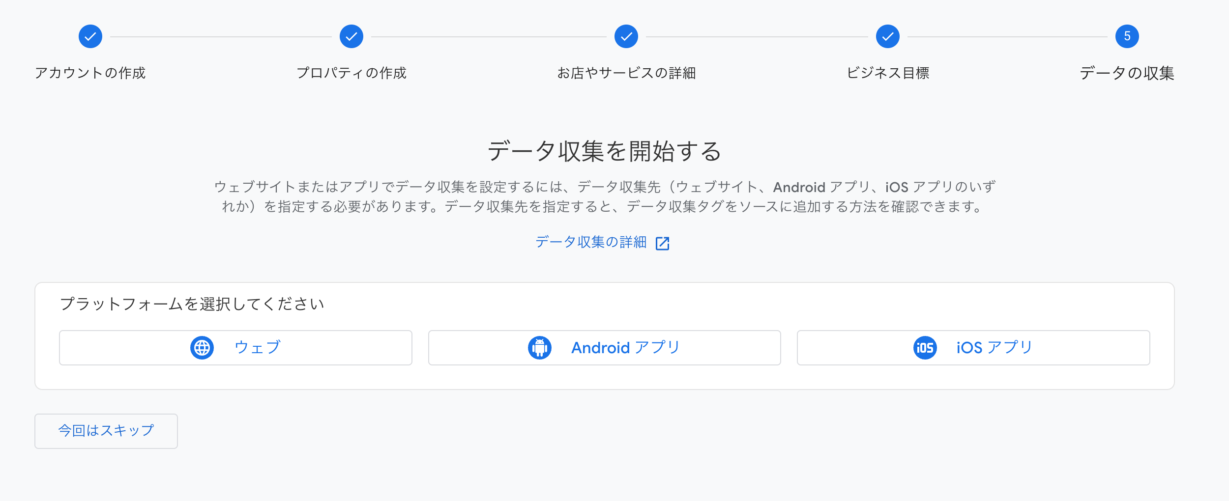 この後データストリームの設定など出てきますが、一旦無視してGA4の設定は完了とします。