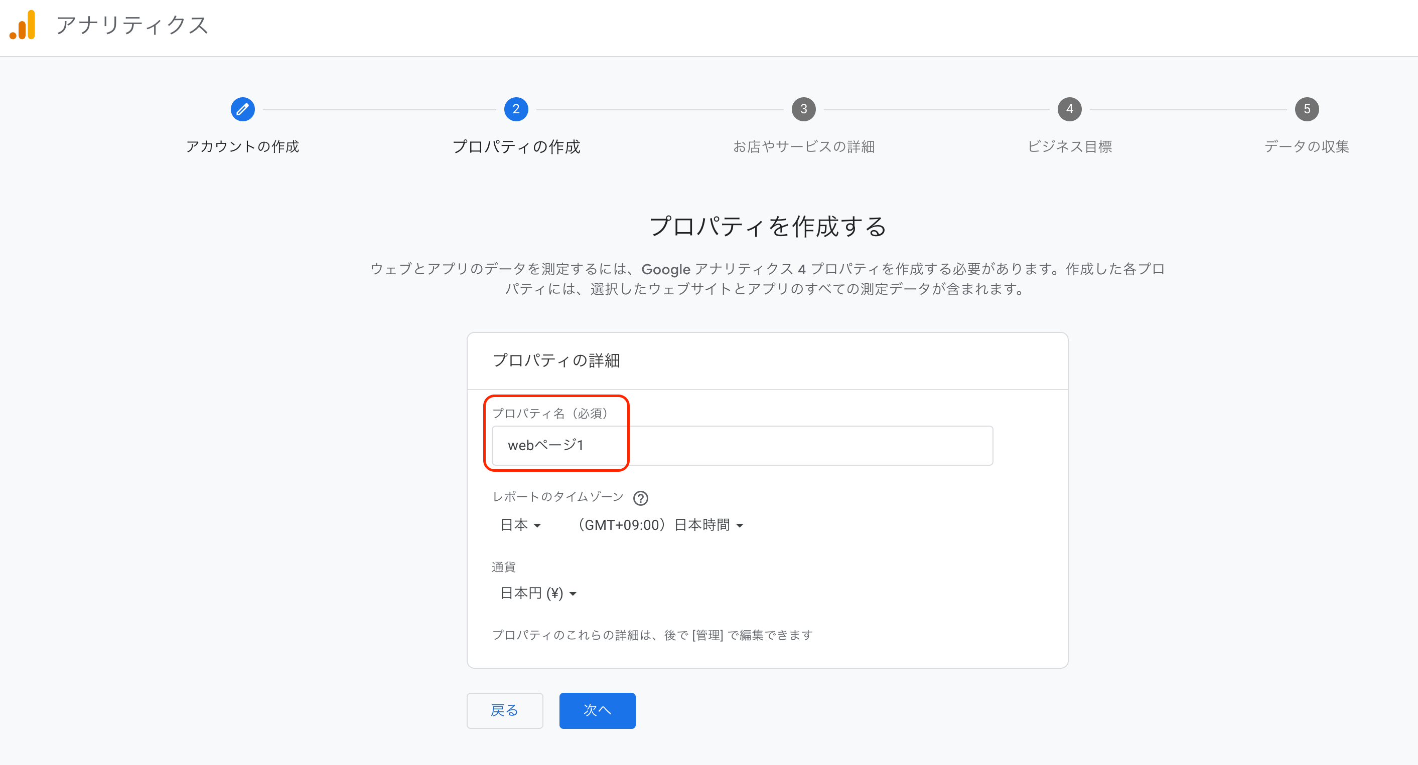 続いてプロパティ名を登録します。ここにはwebページの名前やアプリの名前を登録していきます
