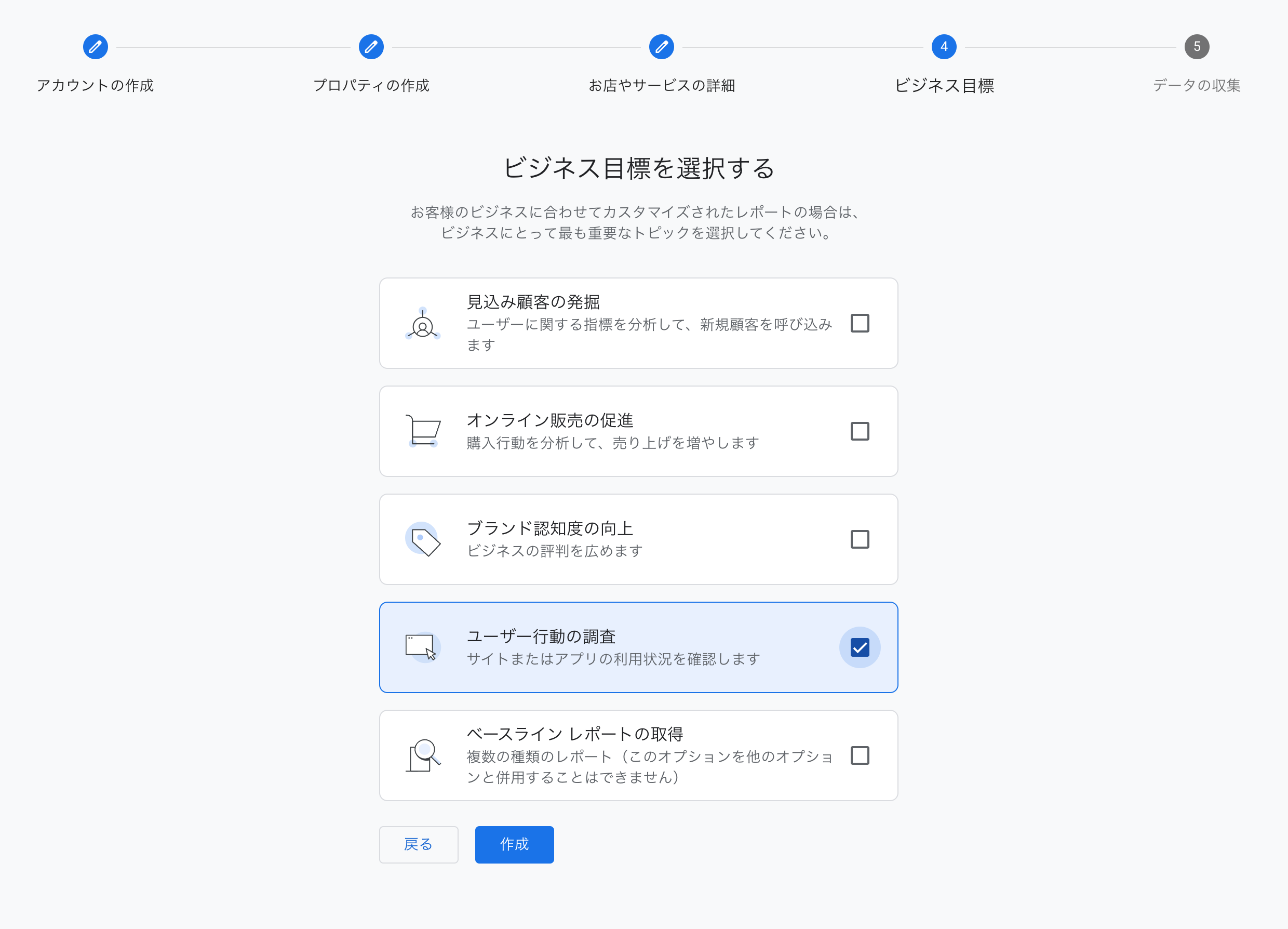 そしてビジネスの目標を入れていきます。分析をすることで得たい効果を選択すると最適なテンプレートを入れてくれます