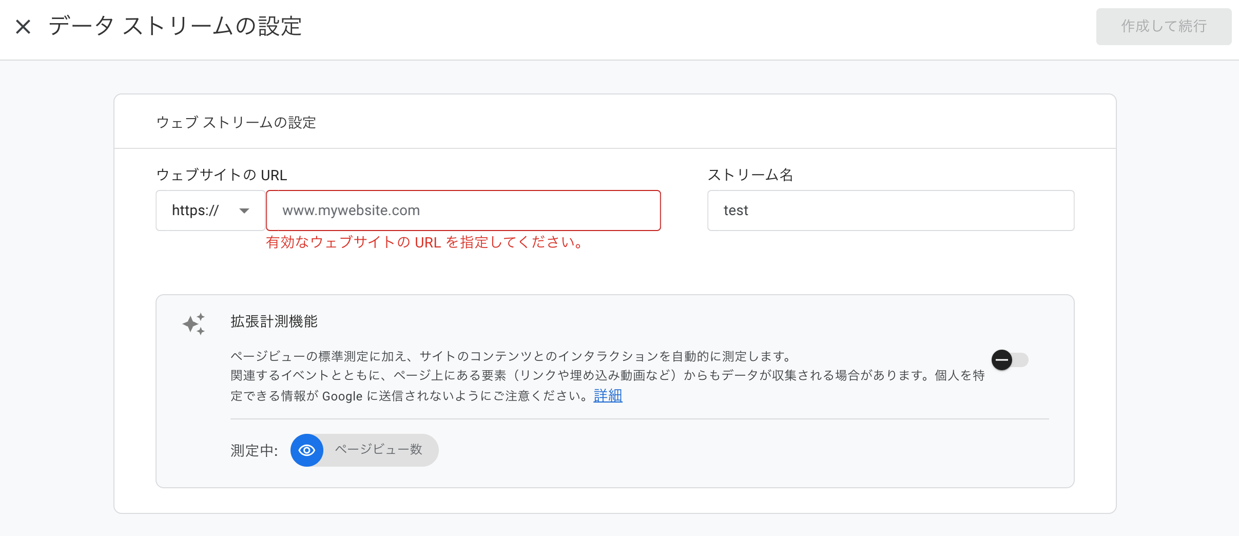 拡張計測機能とは、ユーザーのさらに詳しい動向(しっかりスクロールしてページを全て見ているのか等)を調べるためのものです。今回はそこまで必要ないと思いますので、offで始めました