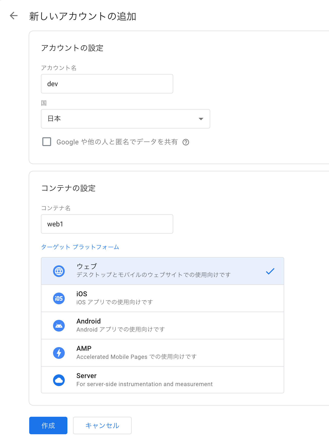 GA4と同じイメージでアカウント名、コンテナ名、使用プラットフォームを選択します