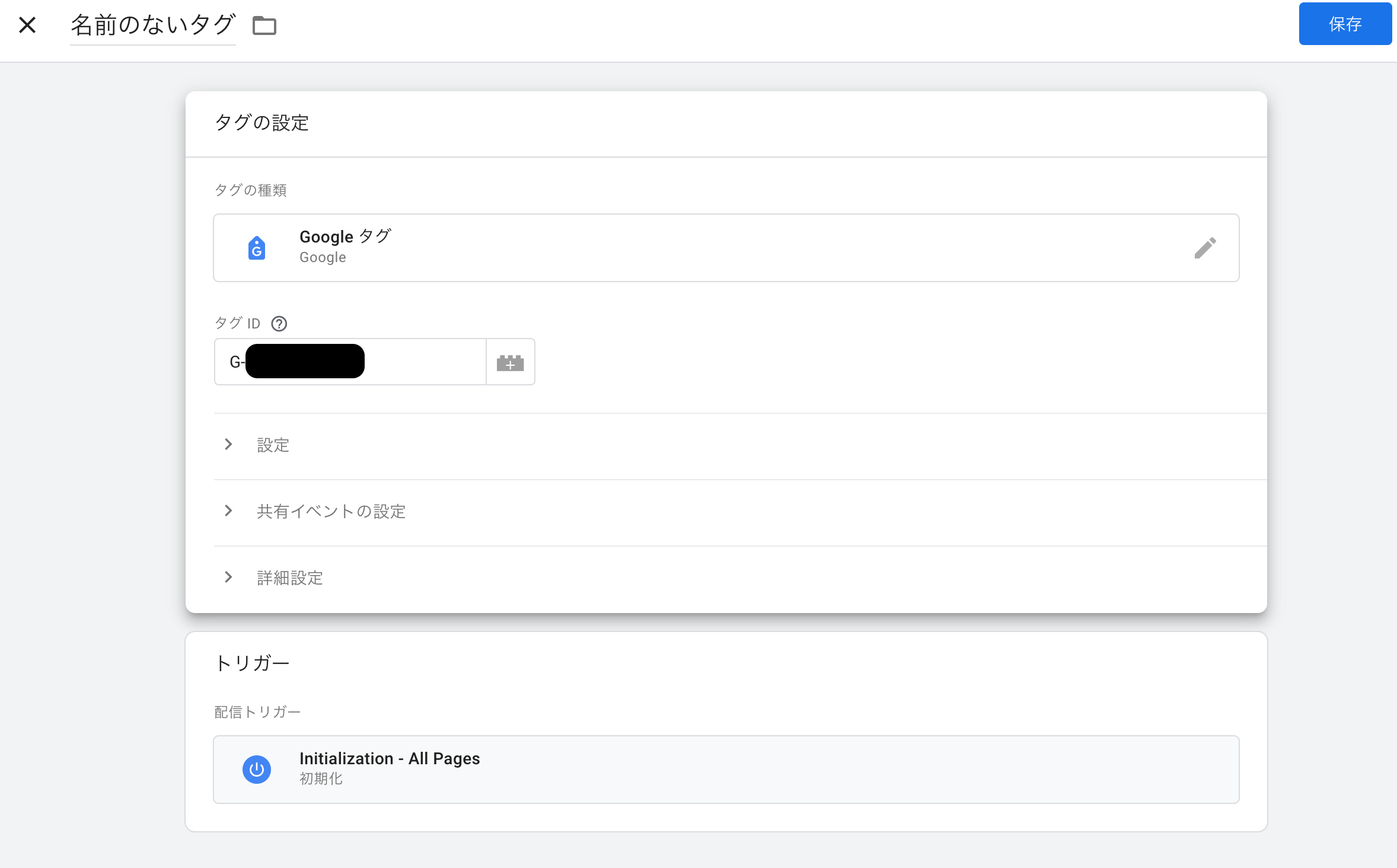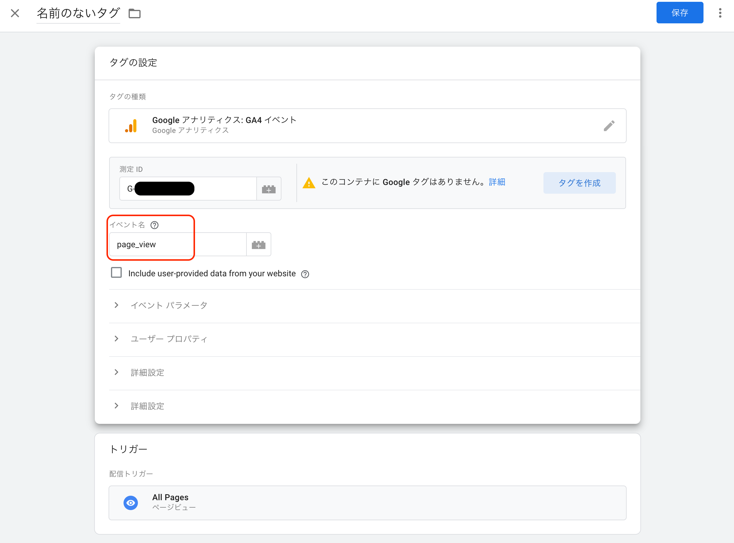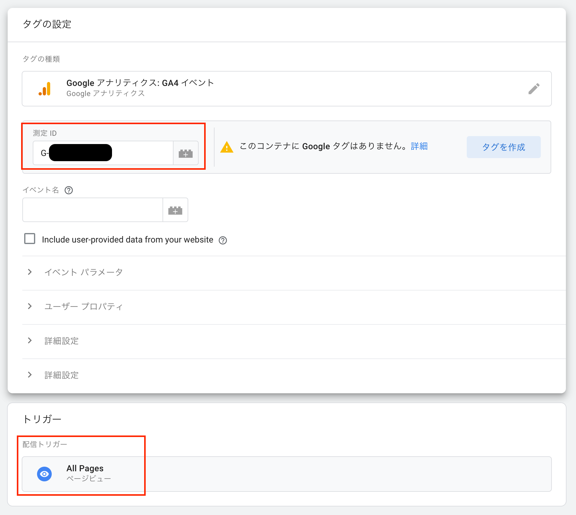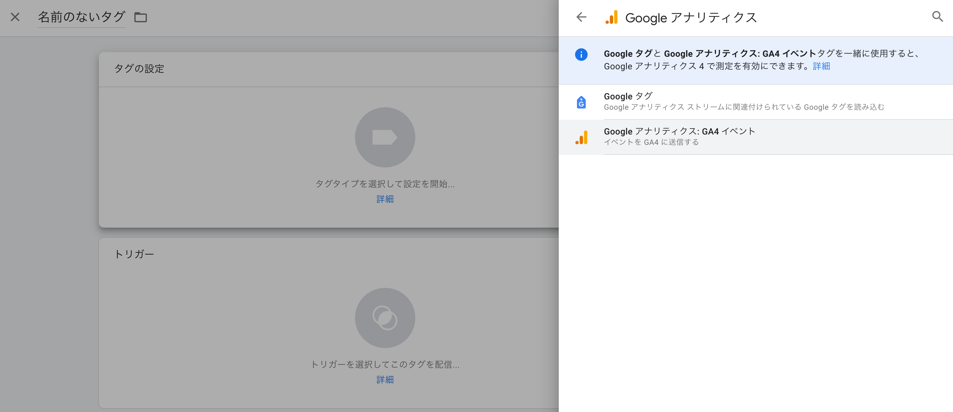 同時に、このコンテナにGoogleタグはありませんの隣のボタンからgoogleタグも作成します。タグIDにGA4の測定IDが自動的に挿入されます