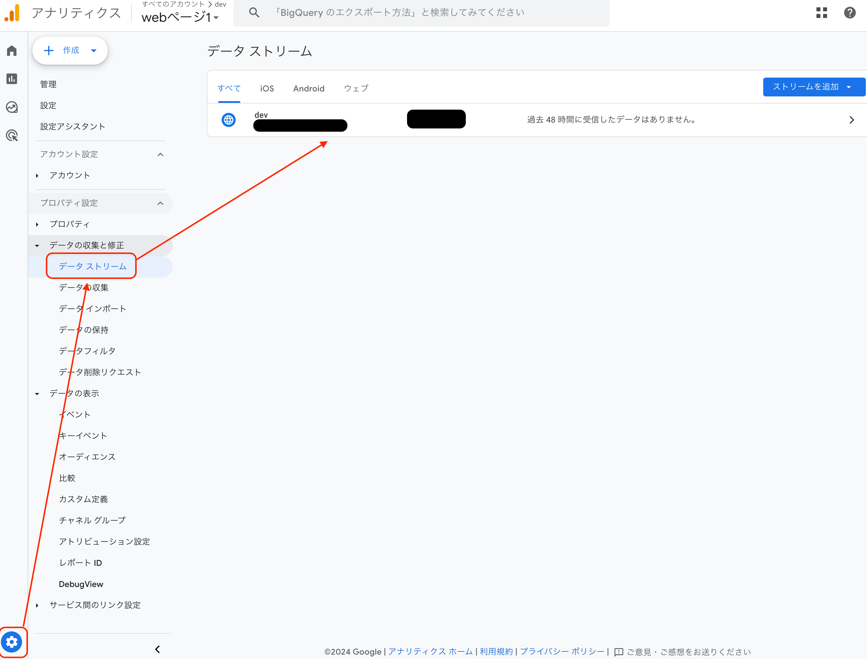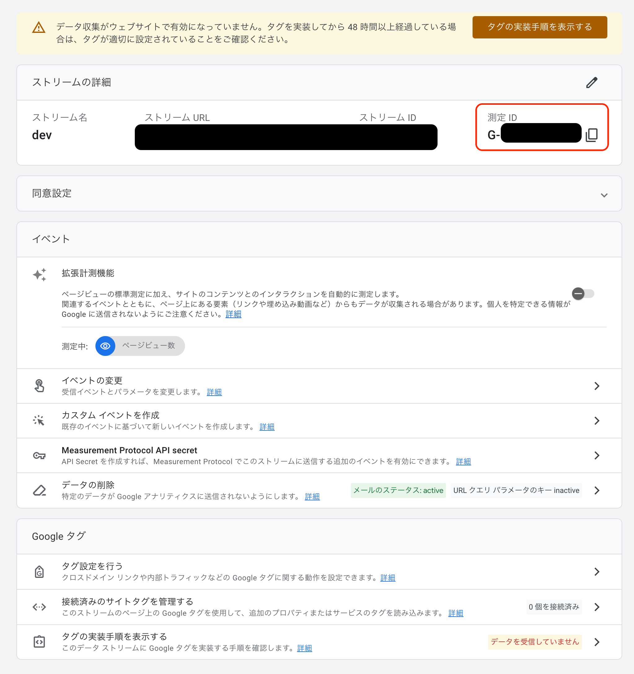 一旦GA4に戻って、設定->データの収集と修正->データストリームからG-から始まる測定IDを取得しました