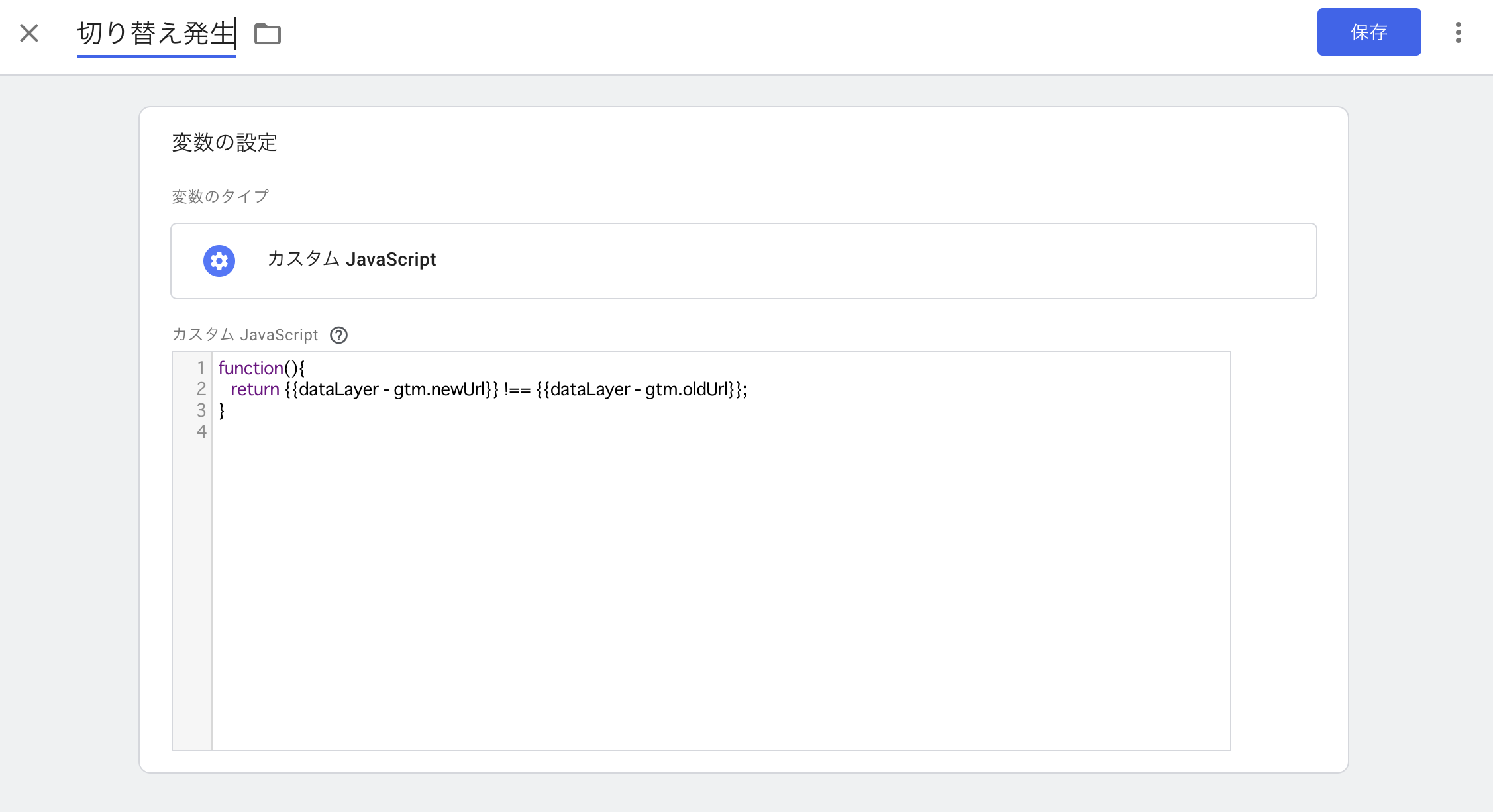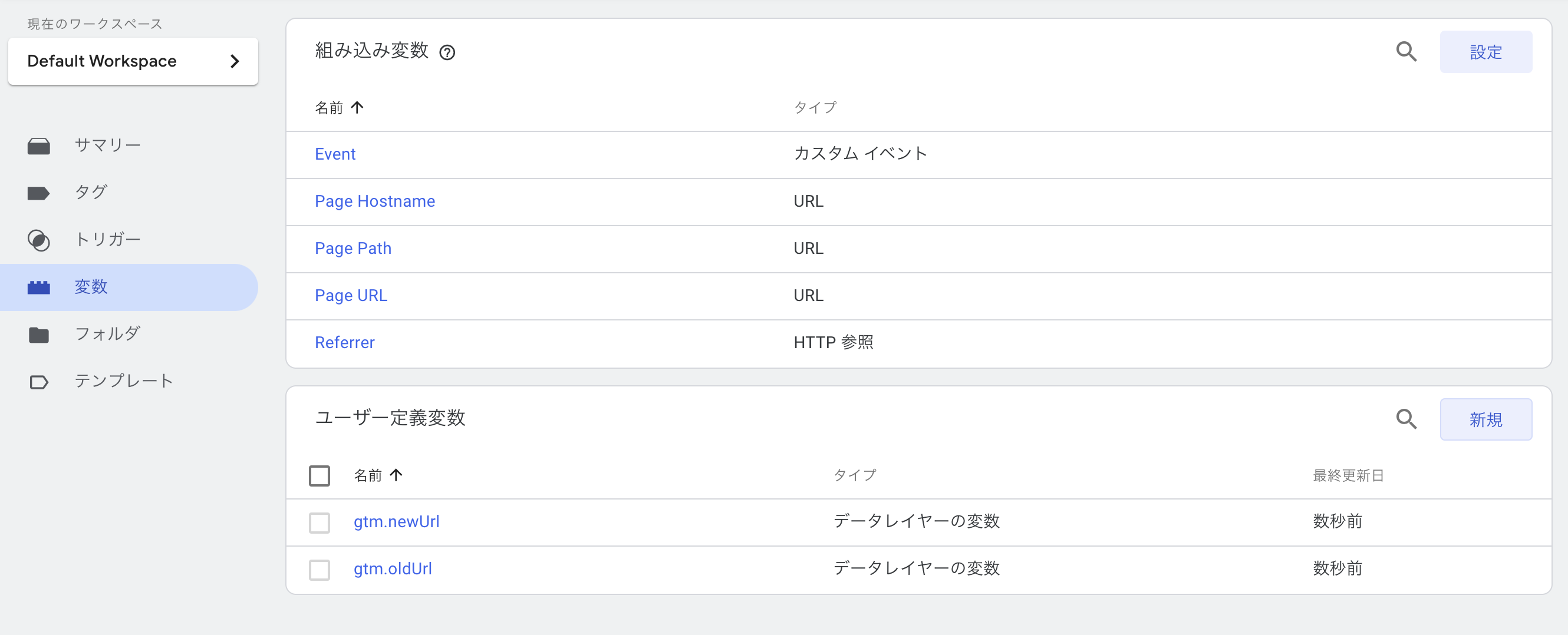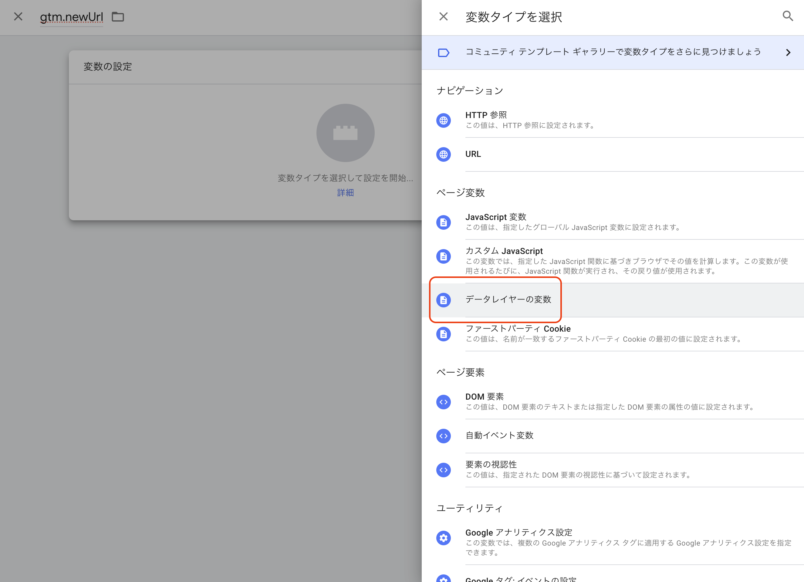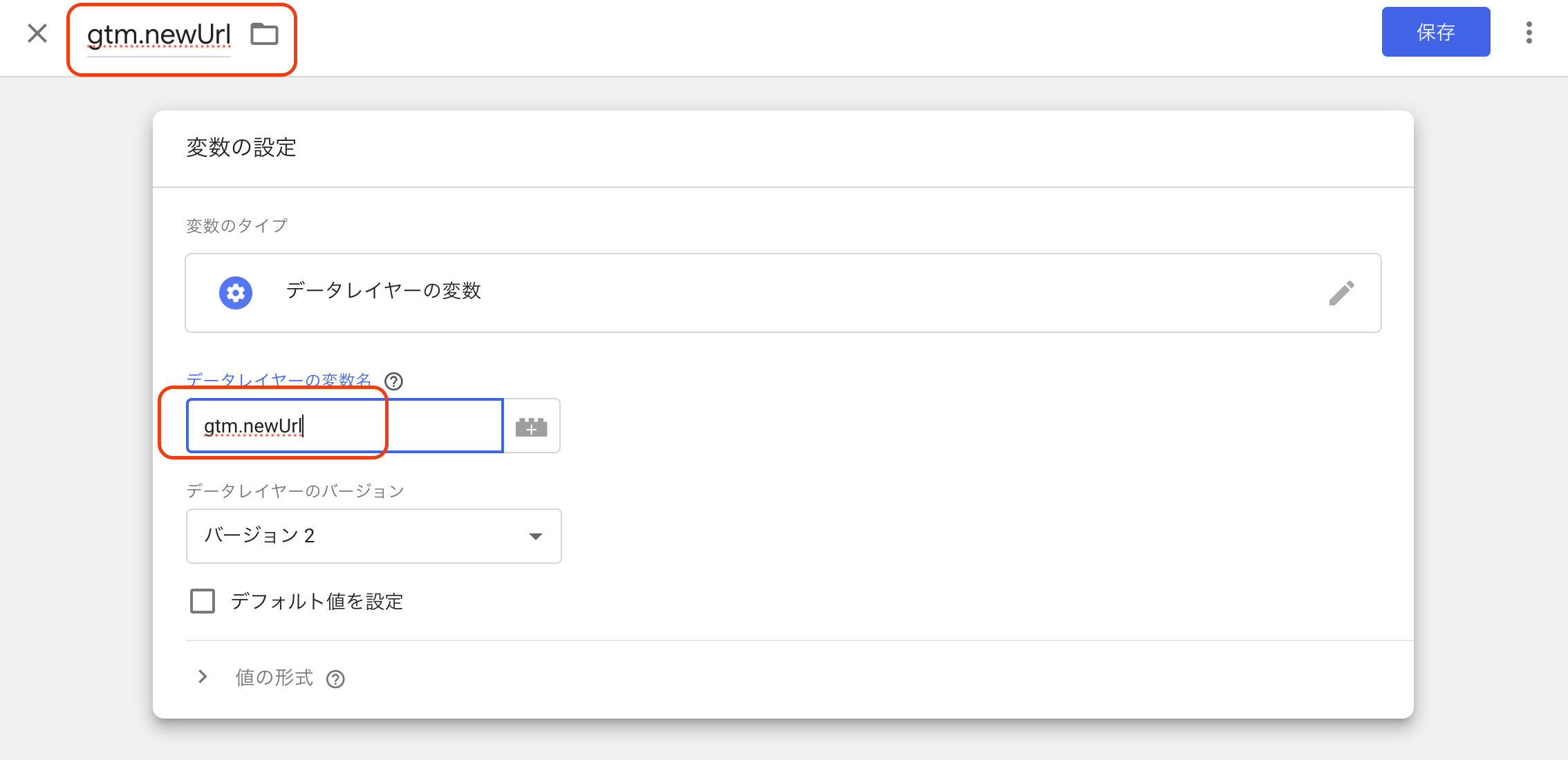 変数名にgtm.newUrlを入れます。名前も同じにしました