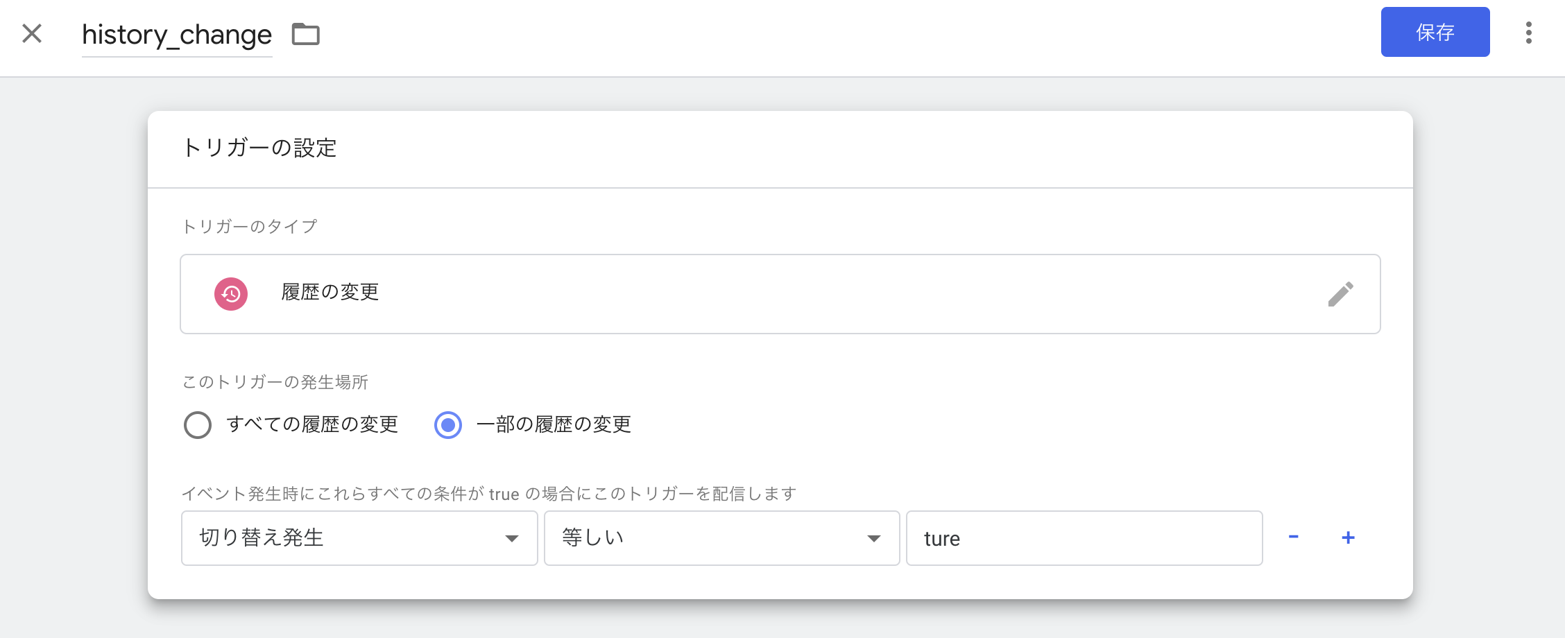 設定から、先ほど設定したカスタム変数がtrueのとき、トリガーされるように設定して保存します