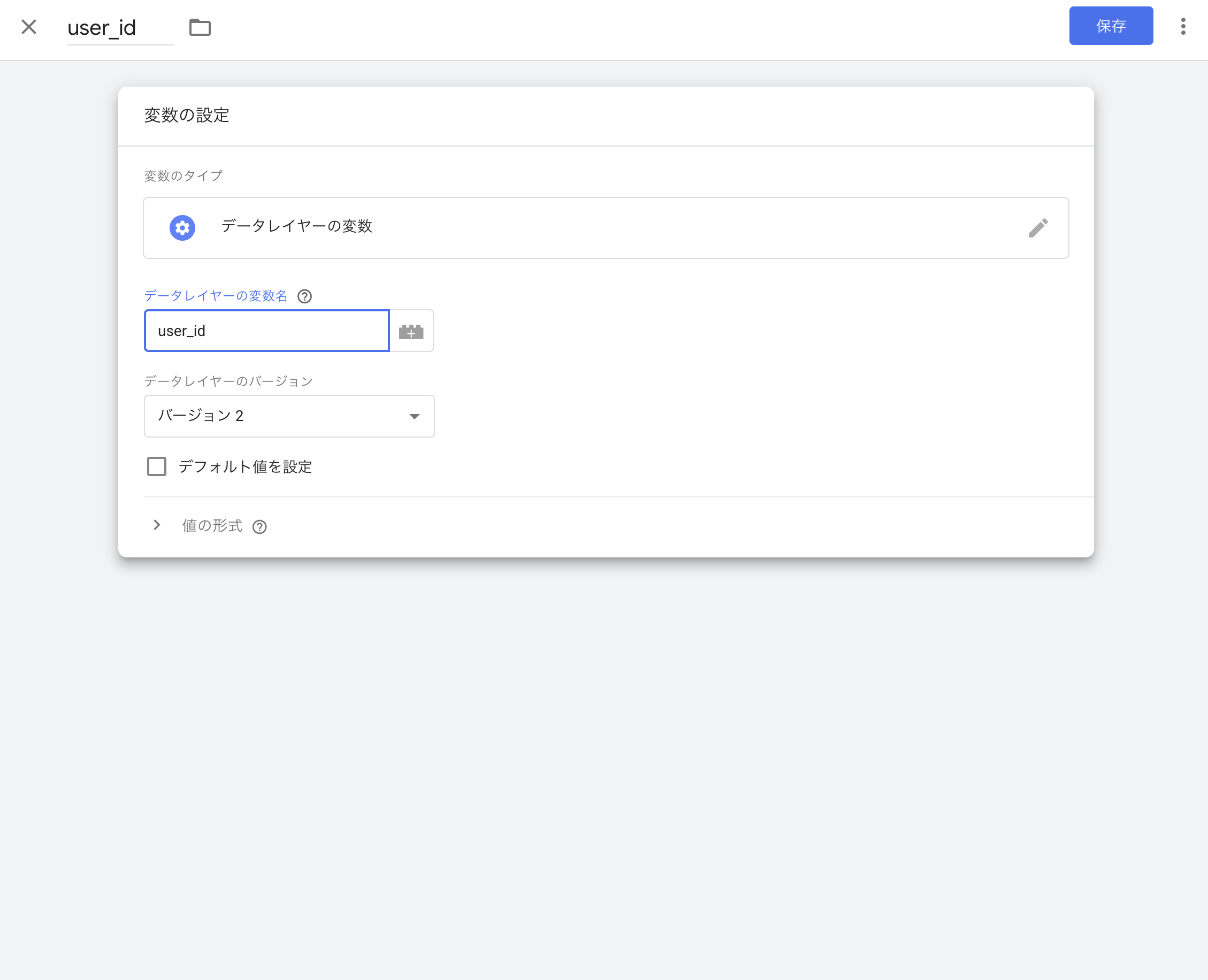 先ほどoldUrlとnewUrlを設定したときと同じように、user_idをデータレイヤーの変数から取得するように追加します