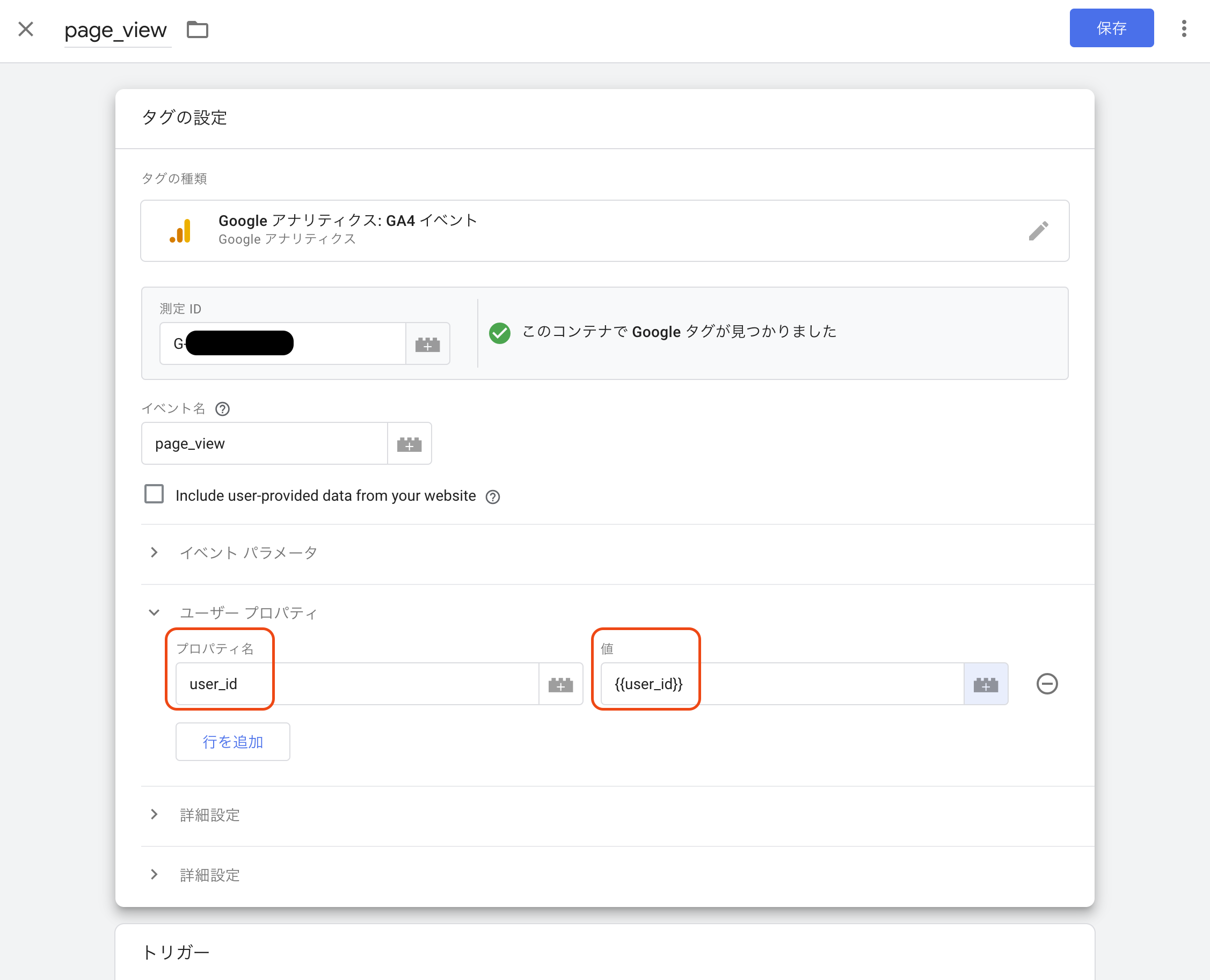 page_viewのタグを開き、プロパティ名にuser_id、値に使用する変数を入れます