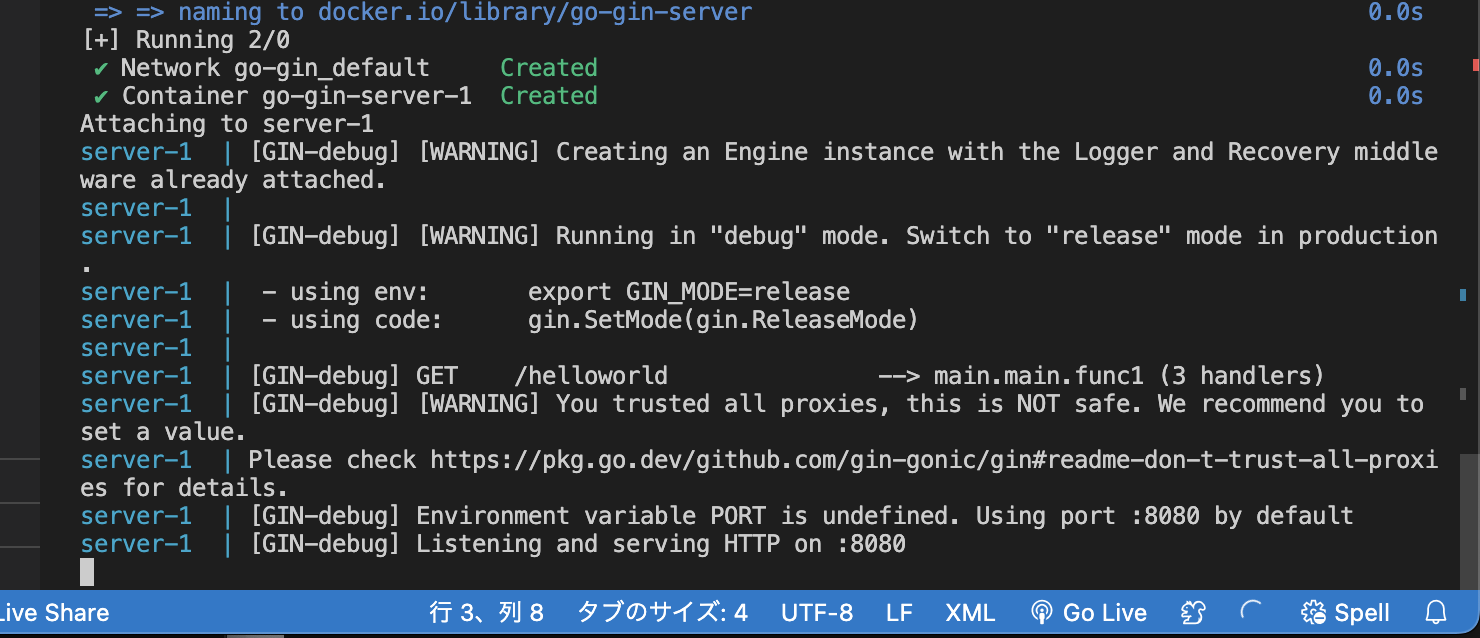 このようにListening and serving HTTP on :8080とでたら成功