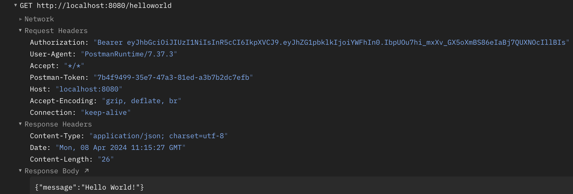 試しにGETしてみると、Hello worldが帰ってきました!!